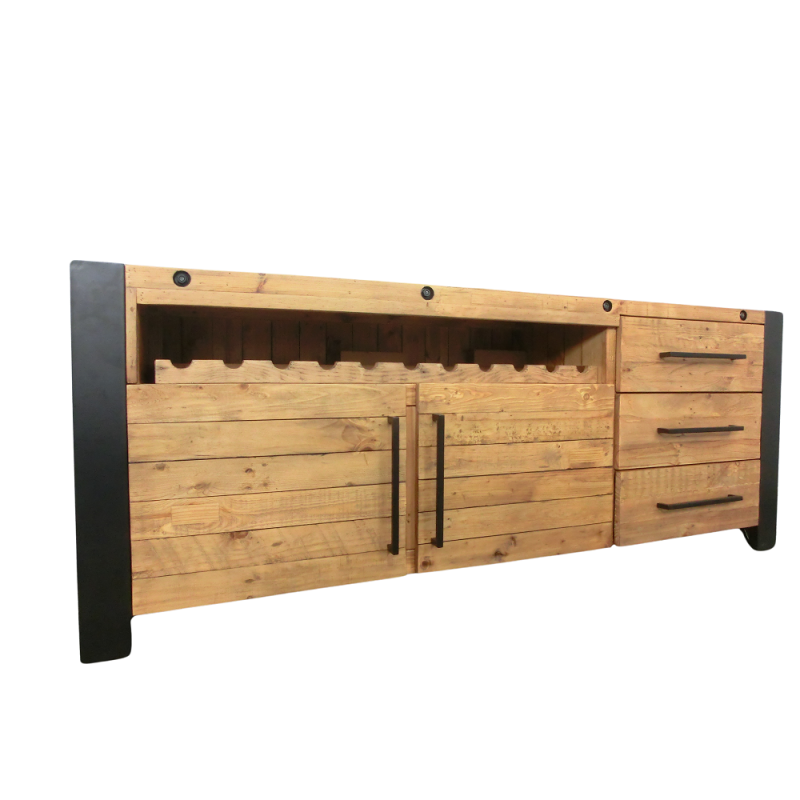 Dovezeno z Německa, rozměry: 193x45x76 cm (šířka/hloubka/výška), držák na lahve až pro 11 lahví - odnímatelný, materiál FSC certifikované masivní dřevo pínie, ošetřené lakovanou povrchovou úpravou, ocelový rám a madla - lakované v černé barvě, moderní industriální koncept, snadná údržba, 2x dvířka s magnetickým zavíráním a 3x zásuvka, dodáváno smontované, výrobce Invicta Interior.