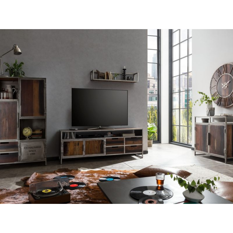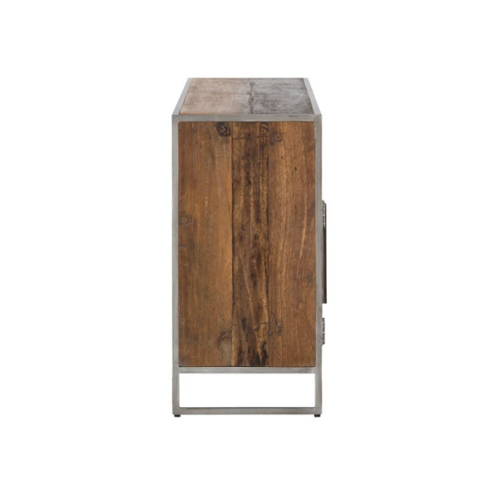 Industriální komoda z recyklovaného dřeva na kovové základně s rozměry 185 x 42 x 85 cm.