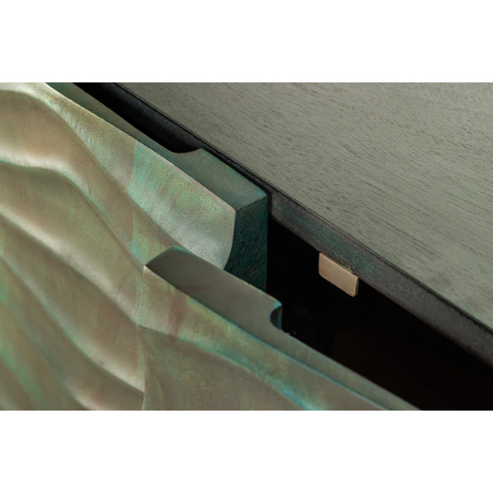 Masivní komoda z mangového dřeva s detailním 3D designem v tyrkysové barvě a unikátním vzhledem s rozměry 160 x 38 x 75 cm