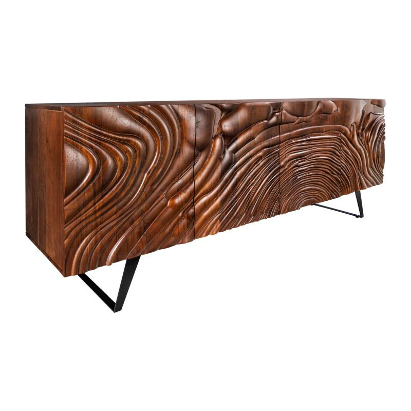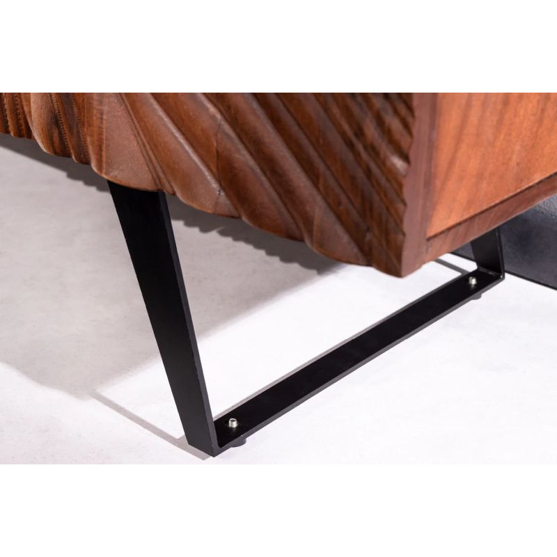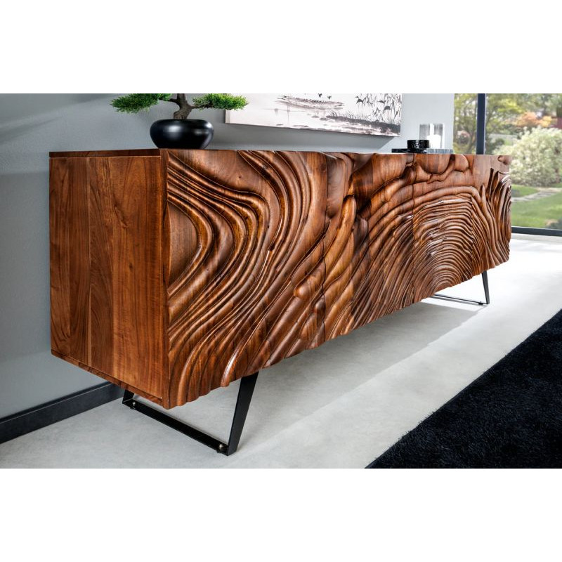 FLUID komoda je vyrobena z pečlivě vybraného akáciového dřeva, které je známé svou odolností a dlouhou životností. Lakovaný povrch nejen že chrání dřevo, ale také mu dodává lesklý vzhled, který se snadno udržuje. Nožky komody z práškově lakovaného železa zajišťují stabilitu a zároveň přidávají moderní akcent k celkovému designu.