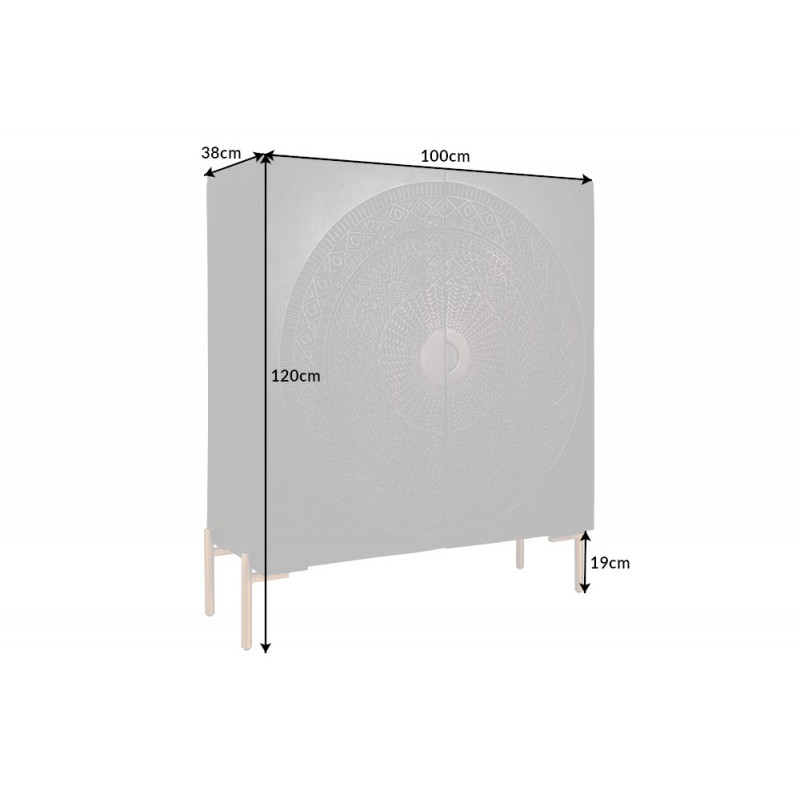 Dovezeno z Německa, rozměry: Š100xH38xV120 cm, přihrádky: 6x Š47,5xH34,5xV31,5 cm, šířka vč. nohou: 105 cm, 6 velkých přihrádek uvnitř, materiál FSC certifikované velice odolné mangové dřevo ručně zpracované, ošetřené lakovanou povrchovou úpravou v černé barvě, dveře bohatě zdobeny ornamenty, kovové nohy lakované ve zlaté barvě, krásný doplněk evokující moderní styl dnešního bydlení, důraz byl kladen na zachování přírodního vzhledu díky jedinečnému ručnímu zpracování a nádherné malbě dřeva s vynikající povrchovou úpravou materiálu, snadná údržba, 2x dvířka s měkkým a tichým zavíracím mechanismem, hmotnost cca 65kg, dodáváno smontované, výrobce Invicta Interior.