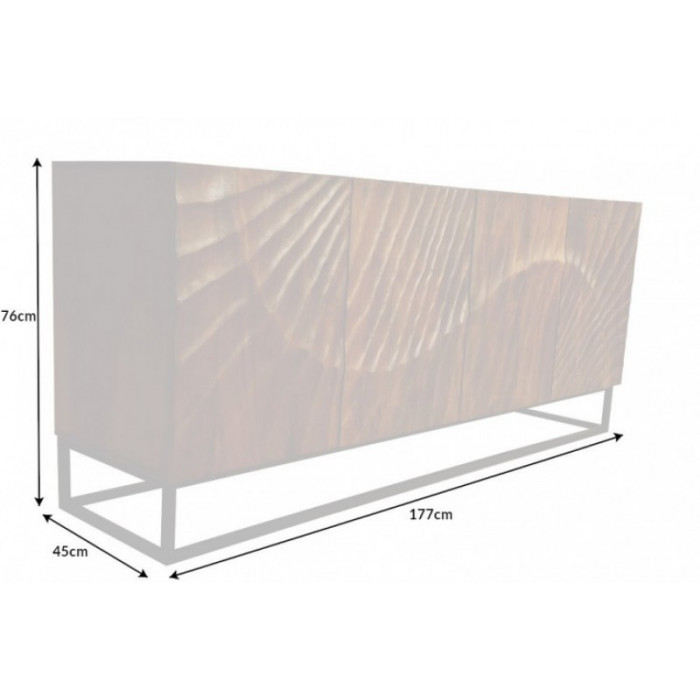 Dovezeno z Německa, rozměry: Š177xH45xV76cm, úložný prostor 4x Š86xH34xV26cm, materiál FSC certifikované velice odolné mangové dřevo ručně zpracované, ošetřené lakovanou povrchovou úpravou v hnědé barvě, 3D rytiny na povrchu komody, které byly vytvořeny ručně, stabilní kovová základna lakovaná v černé barvě, krásný doplněk evokující moderní styl dnešního bydlení, důraz byl kladen na zachování přírodního vzhledu díky jedinečnému ručnímu zpracování a nádherné malbě dřeva s vynikající povrchovou úpravou materiálu, snadná údržba, 4x dvířka s měkkým a tichým zavíracím mechanismem, 2x police, hmotnost cca 60kg, dodáváno smontované, výrobce Invicta Interior.