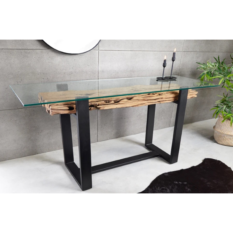 Konzolový stůl BARRACUDA 150 cm, vyplavené teakové dřevo s temperovanou skleněnou deskou