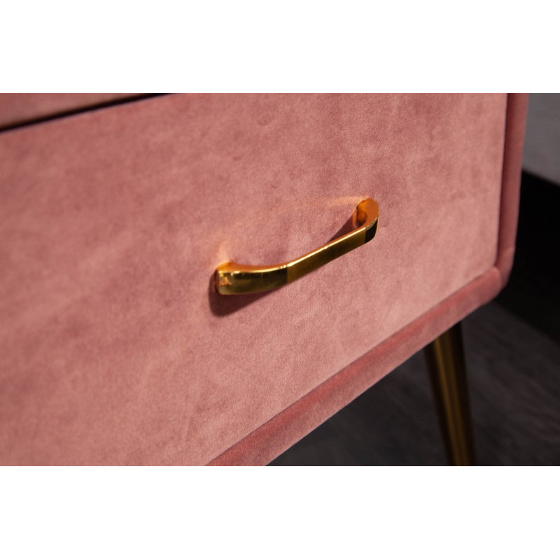 Dovezeno z Německa, rozměry: Š45xH36xV42 cm, zásuvka: Š36xH27,5xV13 cm, materiál velice odolná dřevotříska a MDF, čalounění příjemná látka v sametové optice 100% polyester v moderní starorůžové barvě, kovové nohy a rukojeť ve zlatém dekoru, výrobce Invicta Interior.