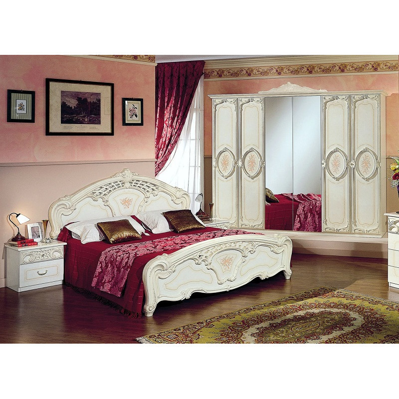 Vyrobeno v Itálii, materiál kombinace dřeva a plastu v lakované povrchové úpravě v béžové barvě, krásná replika dobového nábytku, zásuvky na kovových pojezdech, noční stolky a šatní skříň s kovovými úchyty zdobené vsazenými kamínky, 4dveřová šatní skříň má 2x dřevěné dveře a 2x zrcadlové dveře, za nimi 2 police a 2 šatní tyče vlevo a uprostřed a 4 police vpravo, snadná údržba, dodáváno v demontu, výrobce Domus Mobili Italy.