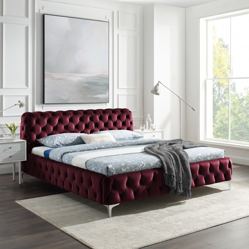 Importiert aus Deutschland, Maße: B196xT239xH100 cm, Liegefläche der Matratze 180x200 cm, Tiefe zum Einlegen des Lattenrostes: 13 cm, Material sehr robuste Spanplatte und MDF, Polsterung angenehmer Samtstoff 100% Polyester in bordeaux, silberne Metallbeine, maximale Belastbarkeit: 500 kg, Lieferung zerlegt ohne Rost und Matratze, Hersteller Invicta Interior.