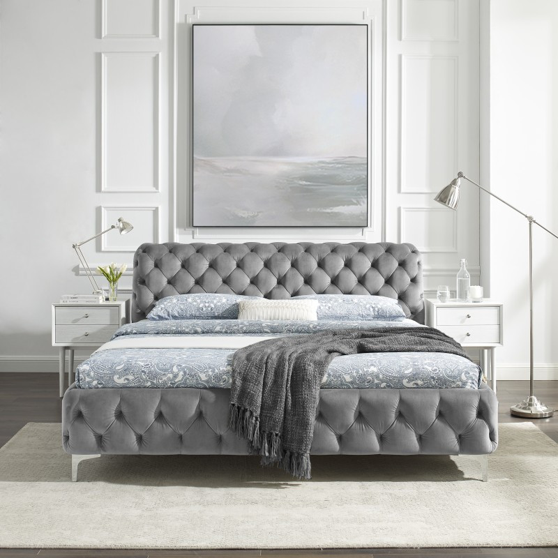 Importiert aus Deutschland, Maße: B196xH239xH100 cm, Liegefläche der Matratze 180x200 cm, Tiefe zum Einlegen des Lattenrostes: 13 cm, Material sehr robuste Spanplatte und MDF, Polsterung angenehmer Samtstoff 100% Polyester in grau, silberne Metallbeine, maximale Belastbarkeit: 500 kg, Lieferung zerlegt ohne Rost und Matratze, Hersteller Invicta Interior.