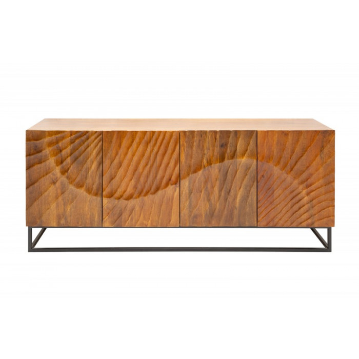 Aus Deutschland importiert, Maße: B177xH45xH76cm, Stauraum 4x B86xH34xH26cm, Material FSC-zertifiziertes, sehr langlebiges Mangoholz, handgefertigt, behandelt mit Lackfinish in brauner Farbe, 3D-Gravuren auf der Oberfläche der Kommode, die von Hand erstellt wurden, stabiles Metallgestell lackiert in der Farbe Schwarz, ein wunderschönes Accessoire, das an den modernen Wohnstil von heute erinnert, wobei der Schwerpunkt auf die Bewahrung des Natürlichen gelegt wurde Aussehen dank einzigartiger Handarbeit und wunderschöner Lackierung des Holzes mit hervorragender Materialoberflächenbehandlung, einfache Wartung, 4x Türen mit sanftem und geräuschlosem Schließmechanismus, 2x Regale, Gewicht ca. 60kg, montiert geliefert, Hersteller Invicta Interior.