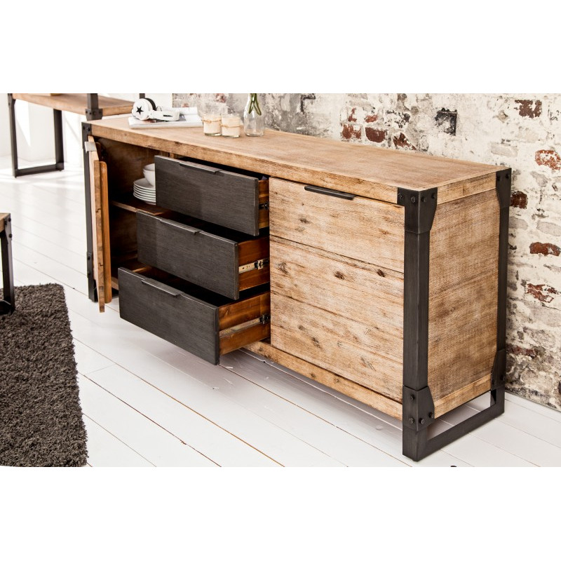 Importiert aus Deutschland, Maße: B180xT45xH80 cm, Schubladen: B50xT40xH15 cm, Fächer: B60xT40xH60 cm, Material: Echtholzfurnier - Akazie kombiniert mit MDF, Material FSC-zertifiziertes, sehr haltbares Akazienholz von Hand verarbeitet, mit Lackierung in Teakgrau behandelt, Metallrahmen in Anthrazitfarbe, stabiler Sockel, schönes Accessoire, das den industriellen Stil des heutigen Wohnens aufgreift, es wurde Wert darauf gelegt, den natürlichen Look zu bewahren, dank der einzigartigen Handarbeit und der schönen Holzlackierung mit exzellentem Materialfinish, pflegeleicht, 3x Schublade, 2x Türen, 2x Einlegeböden, Gewicht ca. 60 kg, Lieferung montiert, hergestellt von Invicta Interior.