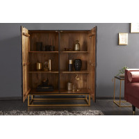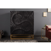 Dovezeno z Německa, rozměry: Š100xH45xV120 cm, přihrádky: 6x Š47xH34xV31 cm, výška nohou: 20 cm, 6 velkých přihrádek uvnitř, materiál FSC certifikované velice odolné mangové dřevo ručně zpracované, ošetřené lakovanou povrchovou úpravou v černé barvě, 3D rytiny na povrchu komody, které byly vytvořeny ručně, stabilní kovová základna lakovaná ve zlaté barvě, krásný doplněk evokující moderní styl dnešního bydlení, důraz byl kladen na zachování přírodního vzhledu díky jedinečnému ručnímu zpracování a nádherné malbě dřeva s vynikající povrchovou úpravou materiálu, snadná údržba, 2x dvířka s měkkým a tichým zavíracím mechanismem, hmotnost cca 65kg, dodáváno smontované, výrobce Invicta Interior.