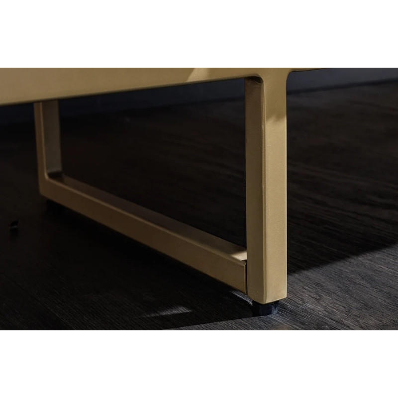 Der Konferenztisch GATSBY 110 cm im Retrostil ist ein elegantes und unverwechselbares Möbelstück, das einen Hauch von Luxus und Raffinesse in Ihr Interieur bringen wird. Der Tisch ist aus hochwertigem Mangoholz gefertigt, das für seine Stärke und seine schönen natürlichen Muster bekannt ist. Die Kombination mit der goldenen Marmorplatte schafft einen schönen Kontrast und unterstreicht das exklusive Aussehen des Tisches.