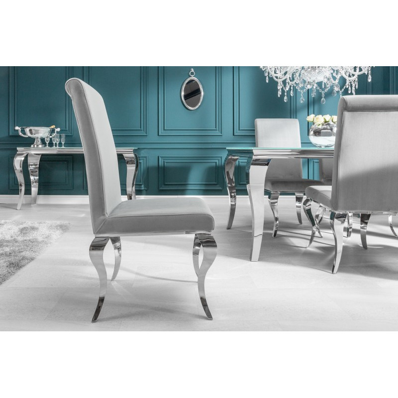 Importiert aus Deutschland, hergestellt für den westlichen Markt, Maße: B45xT64xH104cm, Sitzhöhe 46cm, Sitztiefe 45cm, Sitzbreite 44cm, Bezugsmaterial weicher strapazierfähiger Stoff 100% Polyester in Samtoptik grau, vollgepolstert - für den Raum geeignet, stabiler Edelstahlrahmen, hochwertige Schaumstoff-Polyäther-Polsterung, charismatischer Luxusstuhl im modernen zeitlosen Stil, einfache Pflege mit Anleitung, Hersteller Invicta Interior.