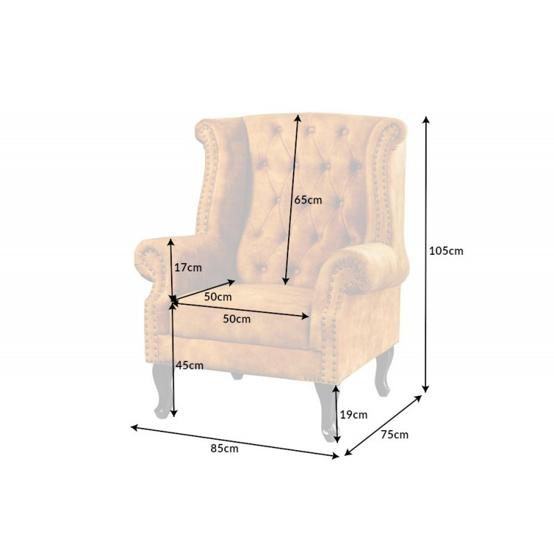 Importiert aus Deutschland, hergestellt für den westlichen Markt, Maße: 85x75x105 cm (Breite/Tiefe/Höhe), Sitzhöhe 45 cm, Sitztiefe 50 cm, Sitzbreite 50 cm, Rückenlehnenhöhe 65 cm, Beinhöhe 19 cm, Bezugsmaterial strukturierter Samtstoff 100% Polyester in Senfgelb im Antik-Look, vollgepolstert - auch für den Raum geeignet, stabiles Gestell aus FSC-zertifiziertem Kiefernholz, Holzbeine, hochwertige Schaumstoff-Polyäther-Polsterung, Stahlfederkern + Sitzfläche komfortables atmungsaktives PUR 20cm dick, Schaumstoffpolsterung Dichte 50kg/m3, schön abgerundete Armlehnen sorgen für eine gemütliche Atmosphäre beim Relaxen, exklusives Wohnkonzept im Chesterfield-Stil, charismatischer Luxussessel im klassisch englischen und doch modernen zeitlosen Stil, pflegeleicht mit Anleitung, Gewicht ca. 30 kg, Hersteller Invicta Interior.
