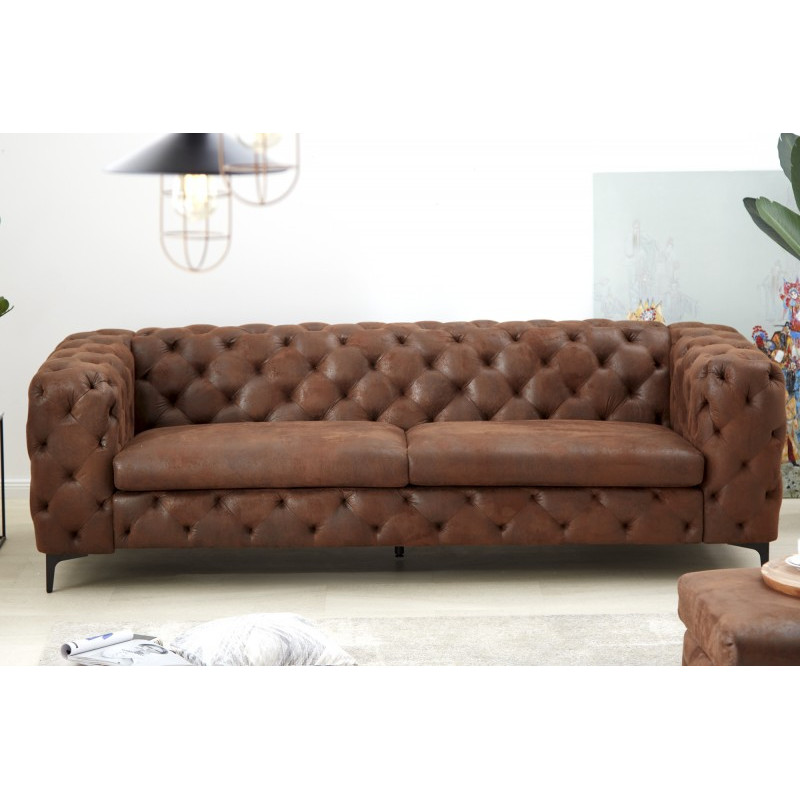 Importiert aus Deutschland, hergestellt für den westlichen Markt, Maße: B240xT97xH73 cm, Sitzhöhe 47 cm, Sitztiefe 63 cm, Sitzbreite 180 cm, Beinhöhe 13 cm, Rückenlehnenhöhe 26 cm, Armlehnenhöhe 26 cm, Bezugsmaterial weiche strapazierfähige Mikrofaser 100% Polyester in brauner Farbe im Antik-Look, vollgepolstert - raumgerecht, stabiles Gestell aus FSC-zertifiziertem Eichenholz, Metallfüße mit Pulverbeschichtung, hochwertige Schaumstoff-Polyäther-Polsterung, Nosag-Stahlfederkern + Sitzkomfort atmungsaktiv pur 20cm dick, Schaumstoffpolsterung Dichte 50kg/m3, schön abgerundete Armlehnen sorgen für eine gemütliche Atmosphäre beim Relaxen, exklusives Wohnkonzept im Chesterfield-Stil, charismatisches Luxussofa im klassisch englischen und doch modernen zeitlosen Stil, einfache Pflege mit Anleitung, Hersteller Invicta Interior.