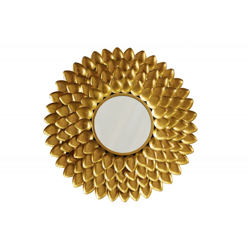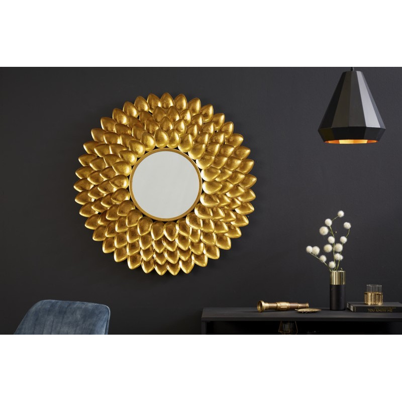 Importiert aus Deutschland, Maße: 90x5x90 cm (Breite/Tiefe/Höhe), Spiegeldurchmesser: 33 cm, Material Eisen in goldfarbener Lackierung, schönes Accessoire, das an den modernen Stil des heutigen Wohnens erinnert, pflegeleicht, wird montiert geliefert, Hersteller Invicta Interior.