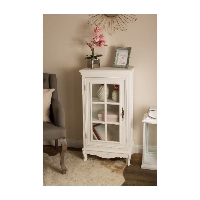 Dovezeno z Německa, rozměry: Š52xH30xV101cm, materiál kombinace dřeva a dřevolaminátu v antické bílé barvě s jemnou patinou starobylého rázu, ručně vyřezávané akcenty s motivem růží, mosazné úchytky s nádherným kontrastem, krásný stylový venkovský kousek, 1x prosklená dvířka, 2x police, snadná údržba, dodáváme smontované, hmotnost: 15 kg, výrobce My Flair.